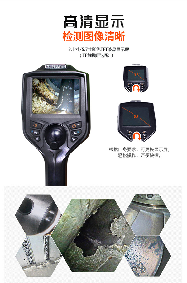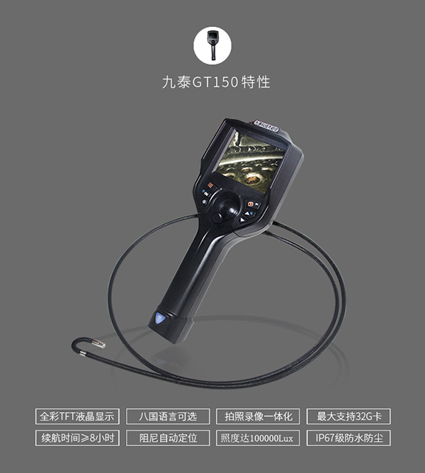 GT150系列手持汽車內(nèi)窺鏡是一款可無限擴展、兼容性超強的智能高清視頻內(nèi)窺鏡。采用全彩TFT液晶顯示屏,高清圖像傳感器,遠(yuǎn)距離圖傳技術(shù),高靈敏度的操作手柄,多層編織工藝的插入管,耐磨防摔的工程合金外殼,整機操作輕便、耐用,拍錄清晰。HD高清實時拍錄,獨特的雙組電池續(xù)航設(shè)計,續(xù)航提升一倍,同時支持電池自主更換。可選2mm-8mm不同直徑探頭,可靠穩(wěn)定、成像效果好!主要用于檢查4~200mm直徑的工業(yè)管路或復(fù)雜狹小的設(shè)備內(nèi)部空間,對腐蝕、裂紋、焊縫、異物、磨損以及零部件內(nèi)部的加工等情況井行細(xì)致全面的檢測。