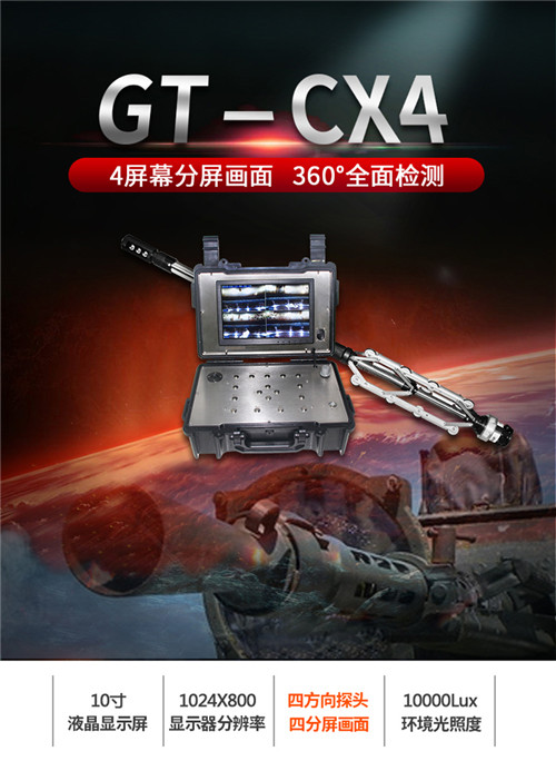 簡介——GT-CX4工業容器內窺鏡可實現一屏四用的檢測效果,分屏檢測更加精細、全面,管道/容器內部360°檢測無死角。自帶可調節