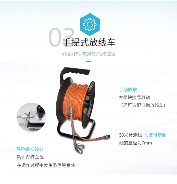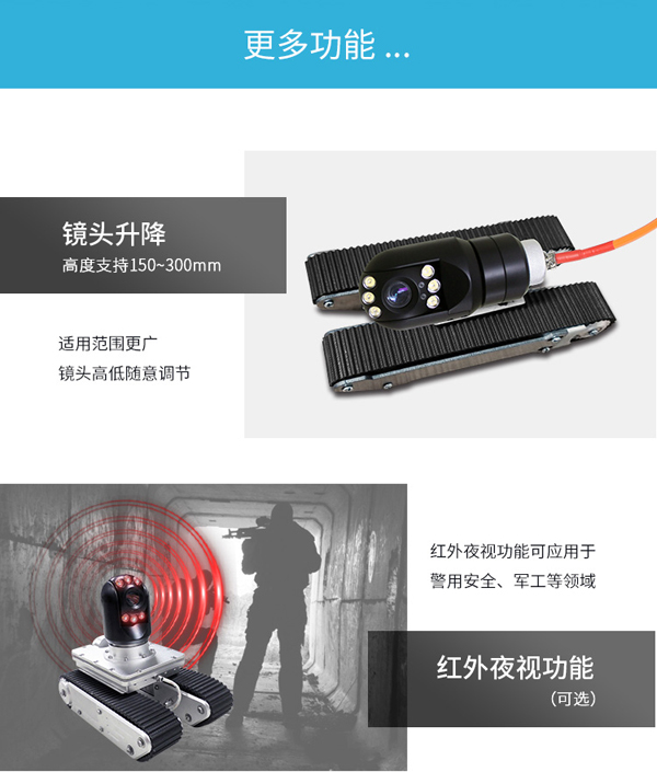 簡介——本檢測儀器由智能可旋轉、翻轉、變倍、對焦鏡頭、智能大功率長時段爬行控制器、專用凱夫拉電纜收放車等組成。適用于警用安全、軍