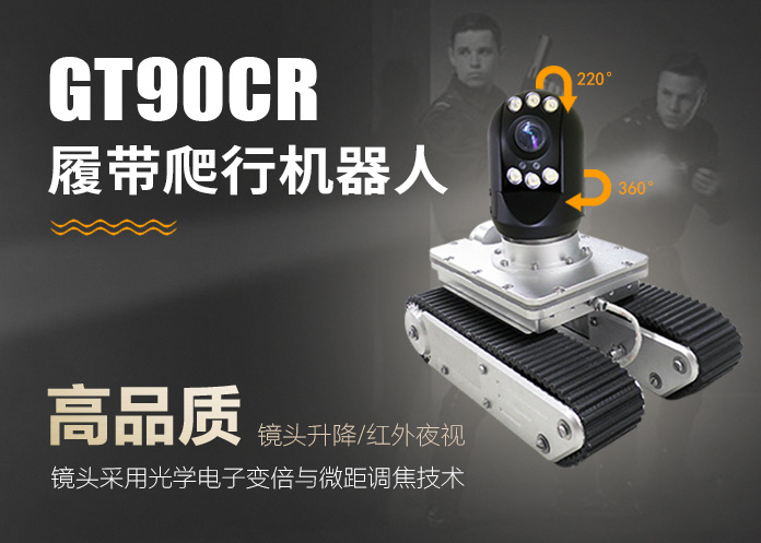 GT90CR系列履帶爬行器由智能可旋轉、翻轉、變倍、對焦鏡頭、智能大功率長時段爬行控制器、專用凱夫拉電纜收放車等組成。