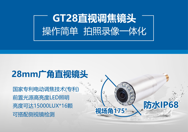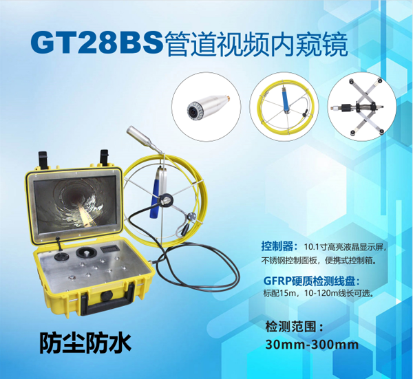 GT28系列管道內(nèi)窺鏡是一款多功能型內(nèi)窺鏡,10.1寸高清顯示智能控制器,10-50m材質(zhì)為GFRP檢測線可供長距離檢測。直徑28mm電動調(diào)焦鏡頭在管道內(nèi)部全方位觀察。