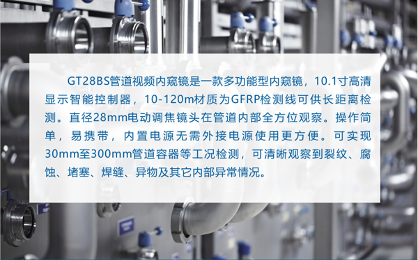 GT28BS工業(yè)管道內(nèi)窺鏡操作簡單,攜帶便攜,內(nèi)置電源無需外接電源等眾多優(yōu)勢。可實現(xiàn)30mm至400mm的管道容器等工況檢測,可清晰觀察到裂紋,腐蝕,堵塞,焊縫,異物及內(nèi)部異常情況。